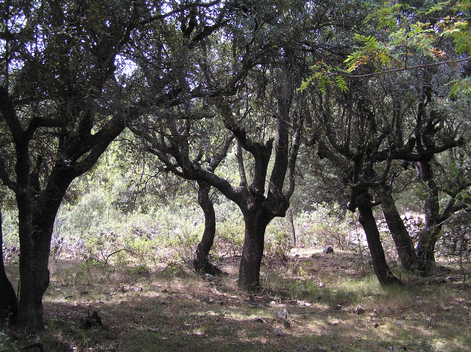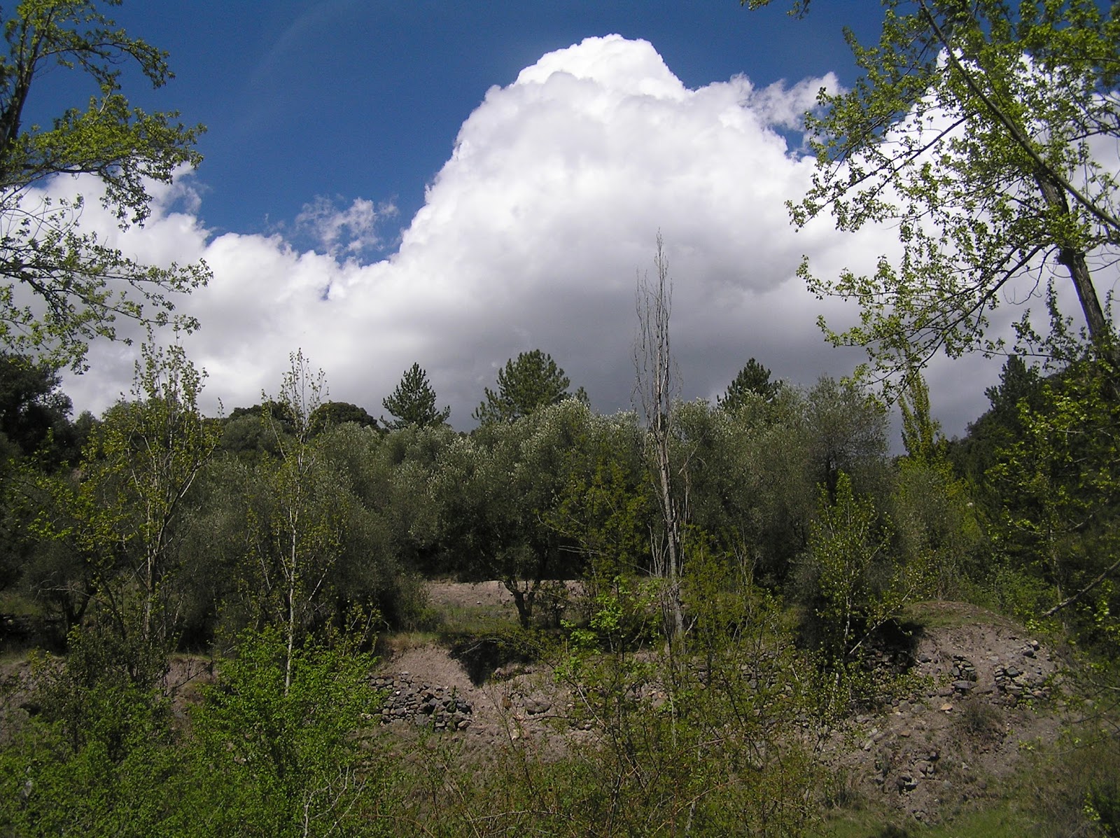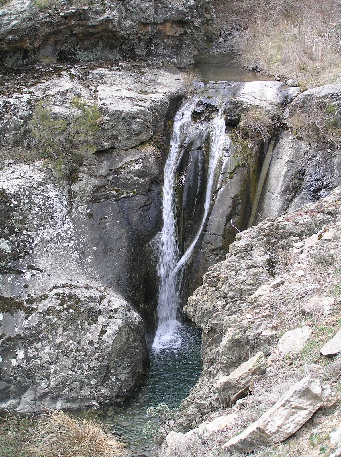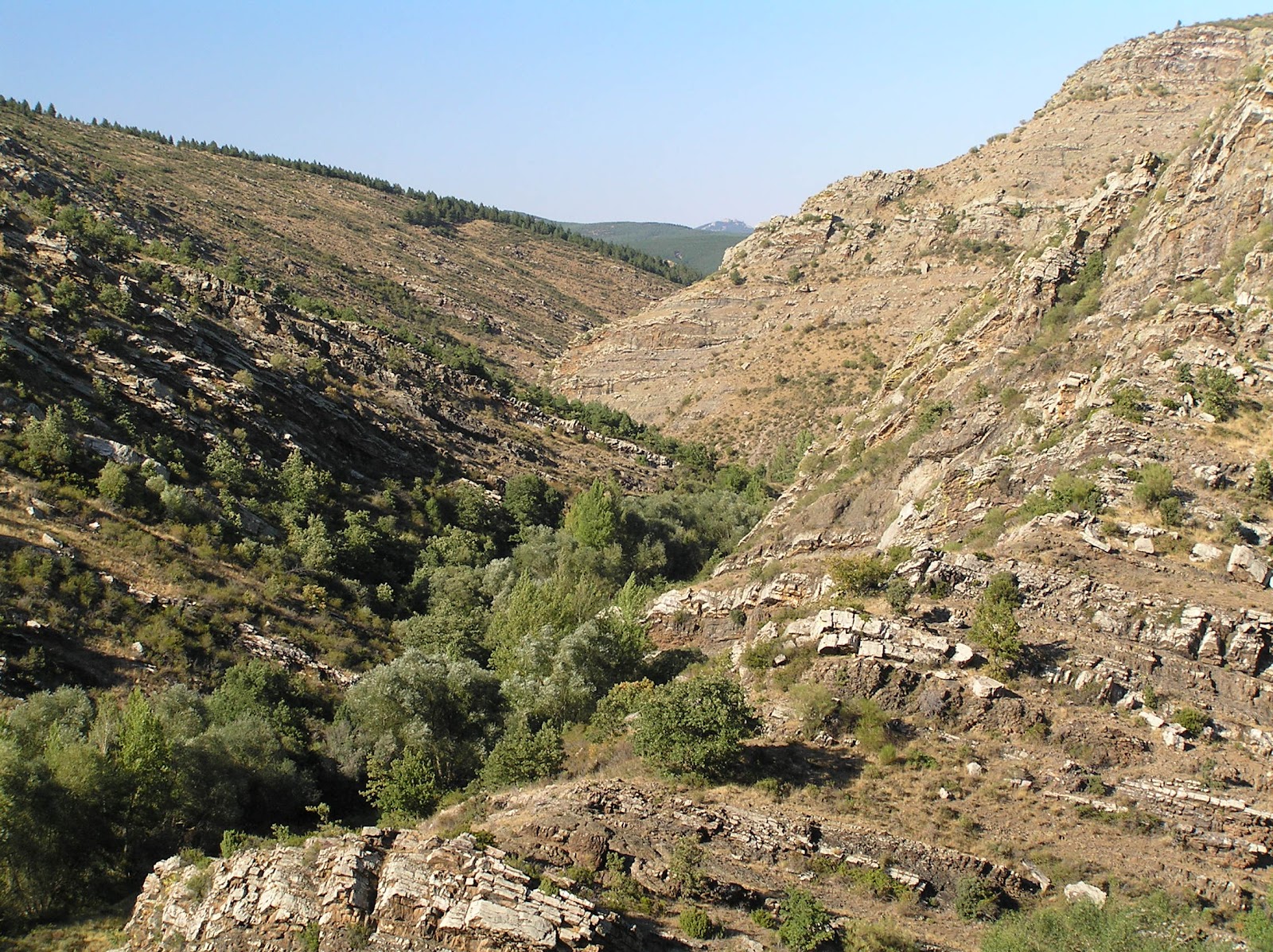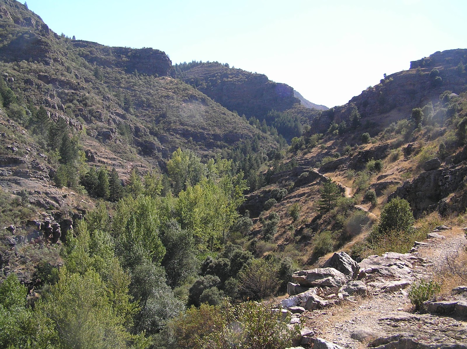 Además de los chopos, sauces, y fresnos de la ribera del río, el lugar nos sorprende con una suerte de mezcla de vegetación puramente mediterránea, formada por encinas, densos sotobosques de jara (incluso algunos ejemplares de coscoja), alterna con especies típicas de la región eurosiberiana, como el haya y el cerbellano (en las exposiciones septrentionales del Ayedo), y el pino albar, con predominio de las repoblaciones de pino laricio, que se observan en la foto siguiente…