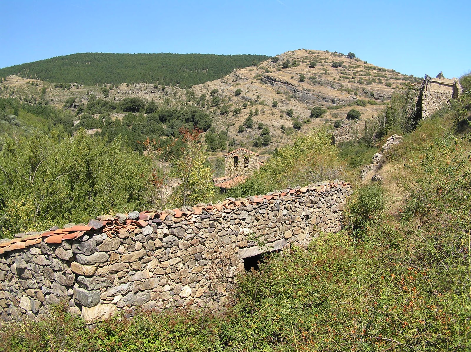 Seguimos andando hacia el centro del pueblo y, mirando hacia arriba, apreciamos las ruinas de la ermita, colocada a modo de vigía, sobre parcelillas de cultivo en terrazas, la única forma de agricultura practicable en este abrupto terreno.
