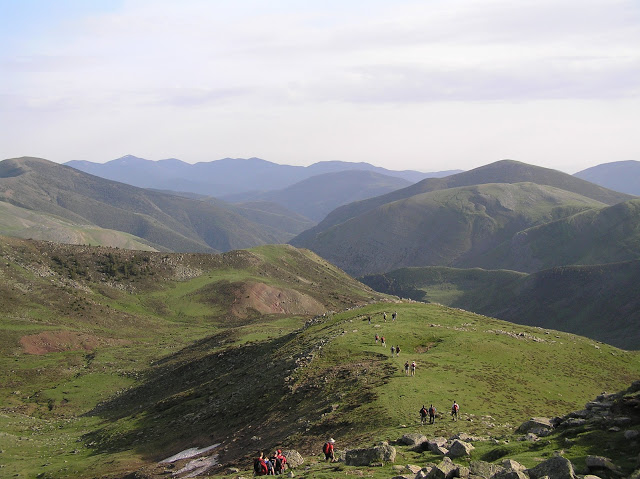 Delante nuestro, se abren hondos valles que divergen hacia distintos puntos. El pico San  Lorenzo, en el que aguanta algún nevero, destaca en el horizonte, justo por detrás de Cabeza Herrera, cuya cumbre redondeada queda próxima, a nuestra izquierda.