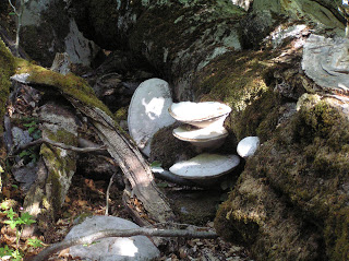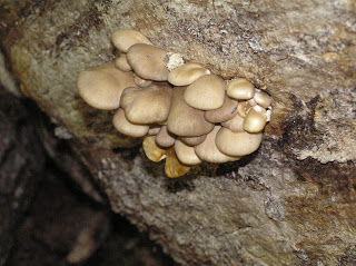 En un ambiente tan húmedo, la madera muerta es rápidamente colonizada por hongos de diferentes especies, como la yesca (Fomes sp., a la izquierda) o la seta de chopo (Pleurotus sp., derecha):