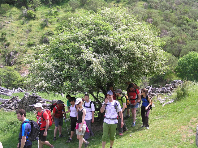 Otra parada para reagruparnos, pues la fila se estiraba mucho y de vez en cuando teníamos que hacer recuento de personal. Parte de los montañeros se apilaban a la sombra de un majuelo con porte de árbol, porque el sol arreaba más duro a medida que nos íbamos acercando a las horas centrales del día.