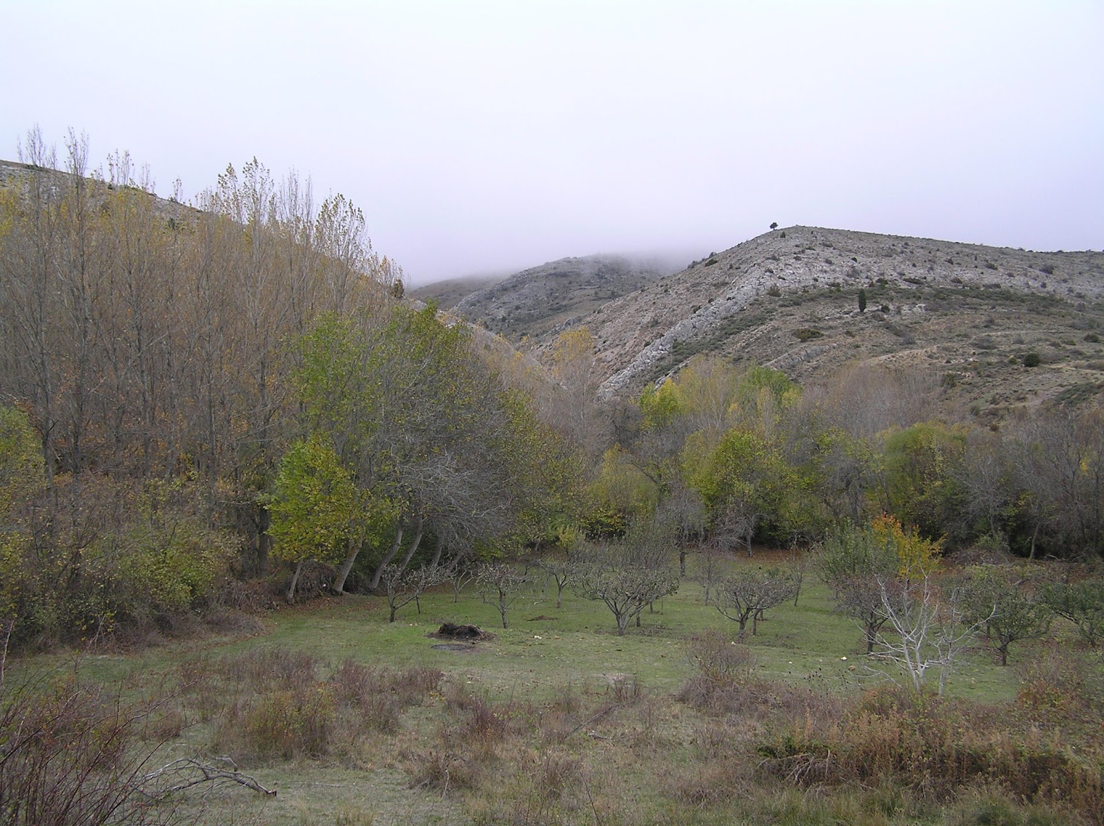 Vista del nacimiento del río Pedro, junto al pueblo, en ese valle envuelto en bruma, tras una zona de huertas con monumentales nogales