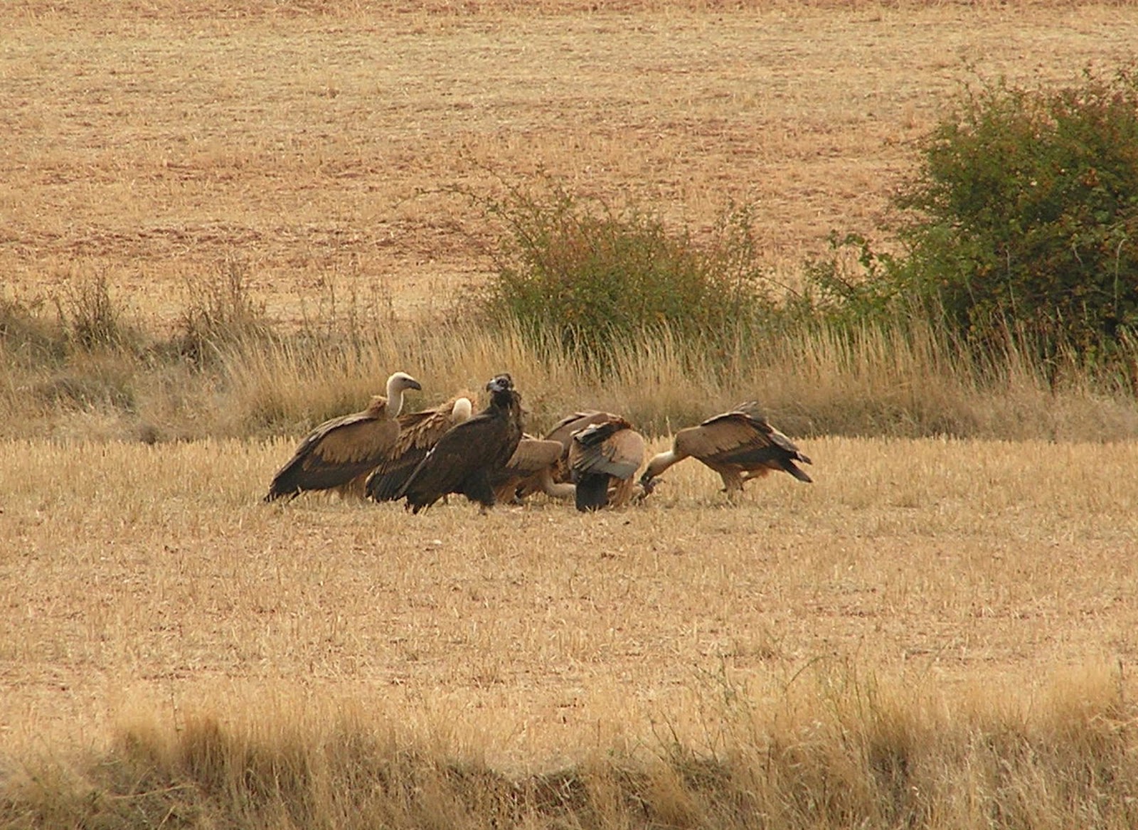 Descubrimos también un buitre o abanto negro, infiltrado en un grupo de leonados, arremolinados en torno a la carroña