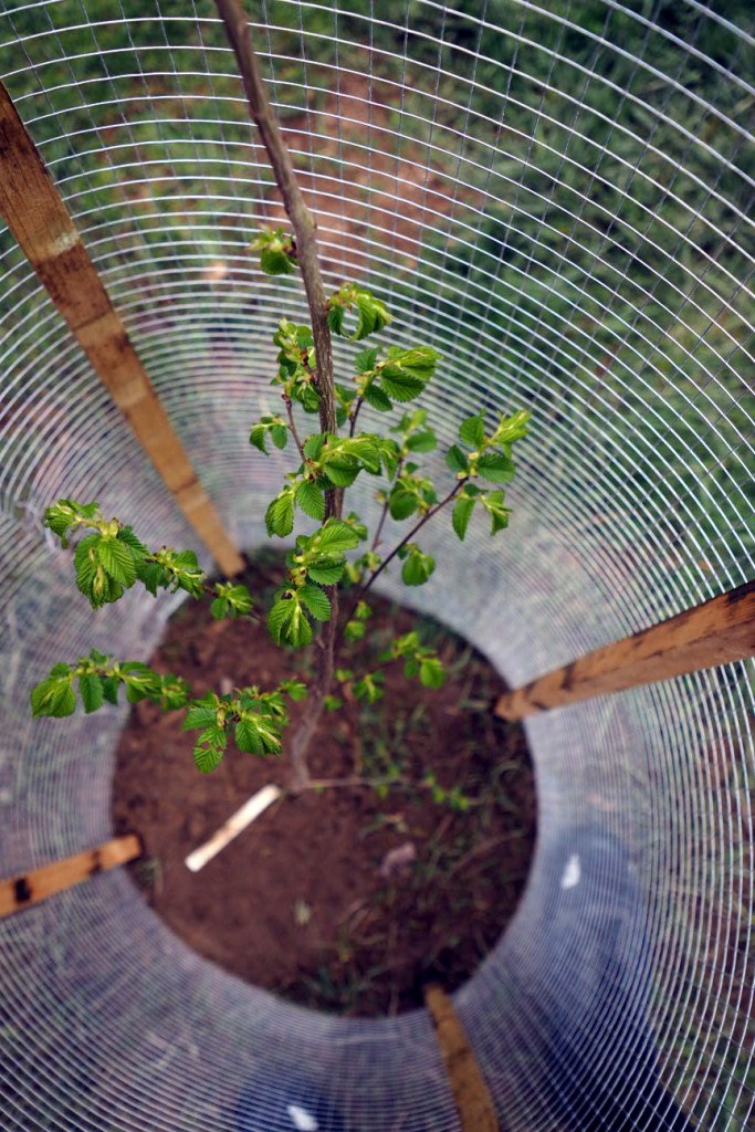 Nuevo olmo resistente a grafiosis plantado junto a las ruinas de la iglesia de SARNAGO (Soria), exactamente en el mismo lugar donde hubo uno centenario hasta que la grafiosis lo secó. Detrás se pueden ver sus rebrotes más altos, actualmente sucumbiendo también a la grafiosis.