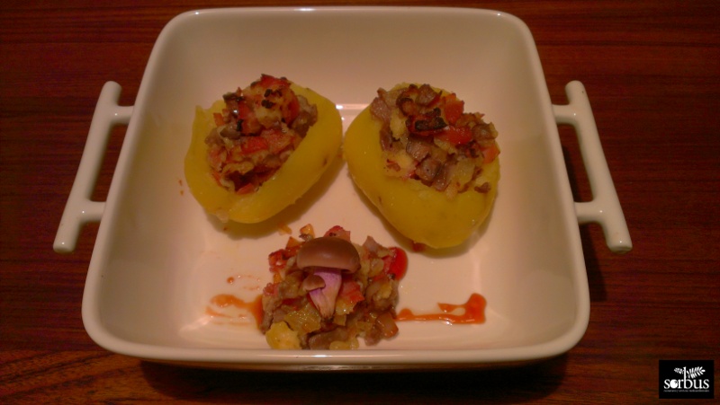 En primer lugar, y para facilitar la digestión de los estómagos delicados, cocimos las setas por un tiempo aproximado de quince minutos. Aprovechamos ese lapso para cocer también las patatas, que vaciamos con cuidado dejándolas con forma de cuencos. Después, preparamos un sofrito de cebolla, y le fuimos añadiendo progresivamente las setas bien picadas, así como taquitos pequeños de jamón y un chorrito de nata. Con esta mezcla rellenamos las patatas y las introdujimos en el horno por un espacio de veinte minutos. El plato que salió del horno tenía el apetitoso aspecto que os mostramos a continuación: